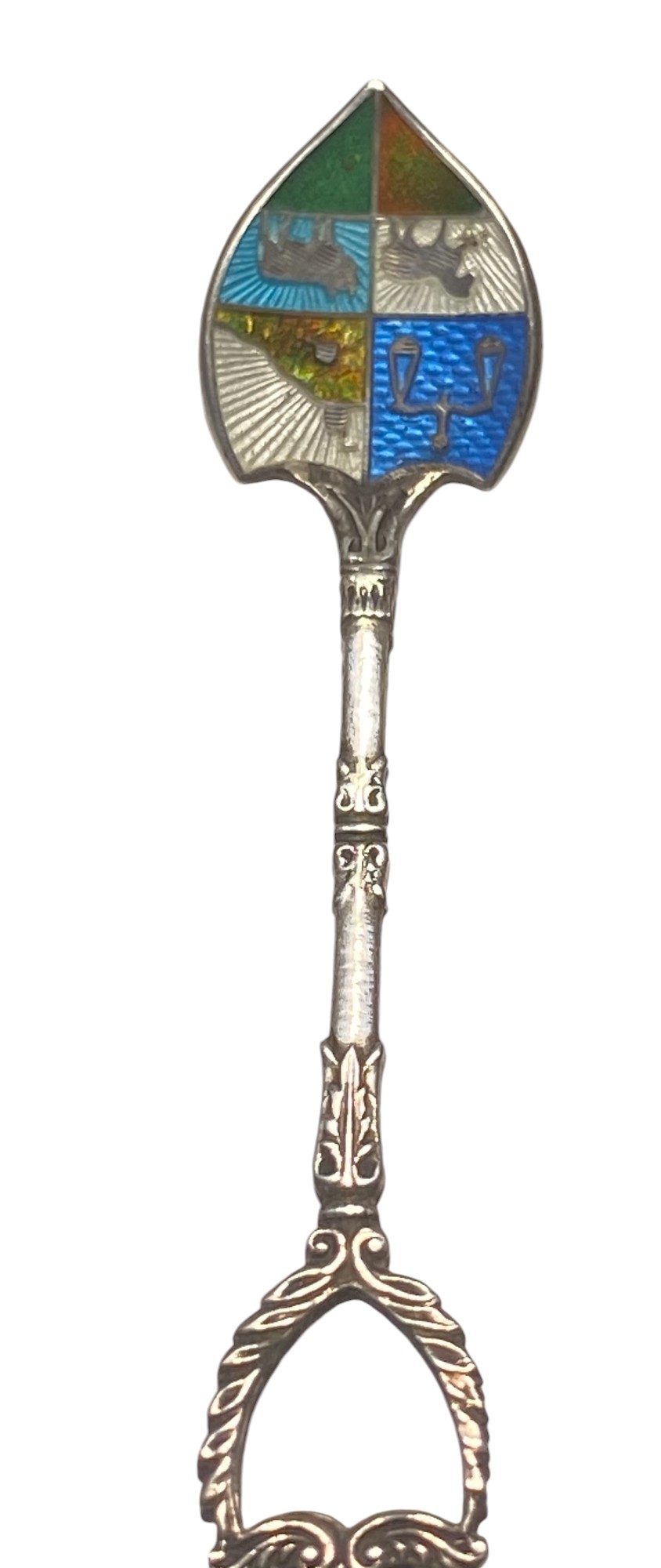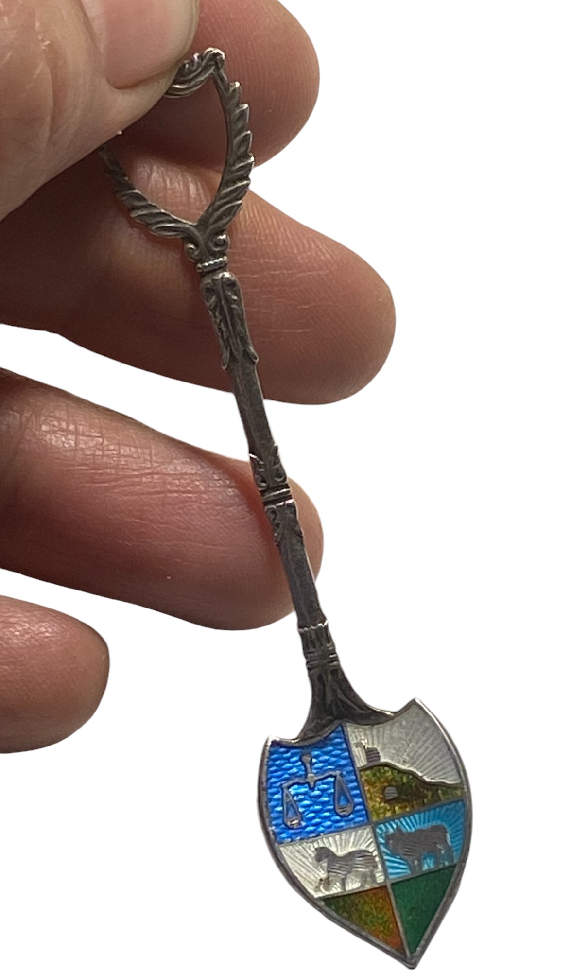 Cuchara pequeña para sacarina, de plata con Esmalte. Contiene diseño hecho a mano de 4 imágenes: balanza, caballo, buey, colina. El mango también tiene un diseño exclusivo ornamental y decorativo. La longitud de la misma es de 7 cm total.