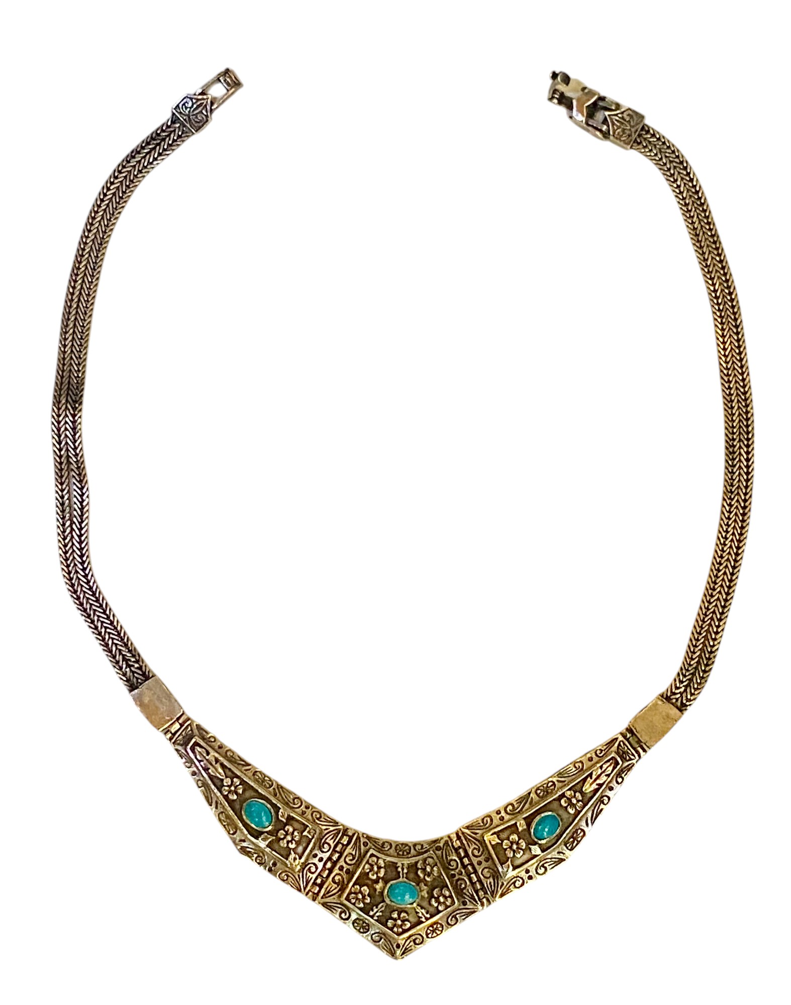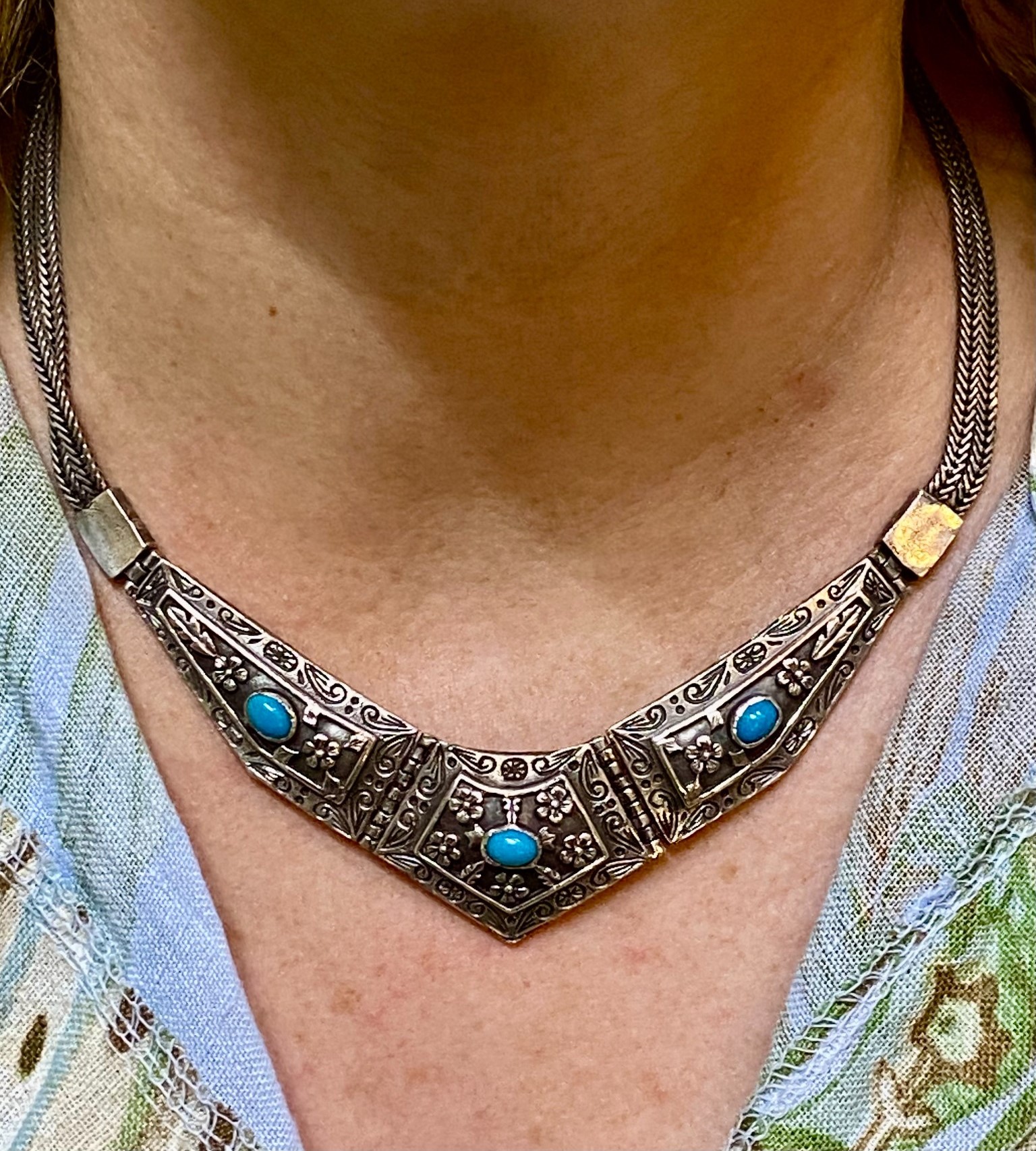 Antigua gargantilla en Plata con Turquesas Cabouchon.
