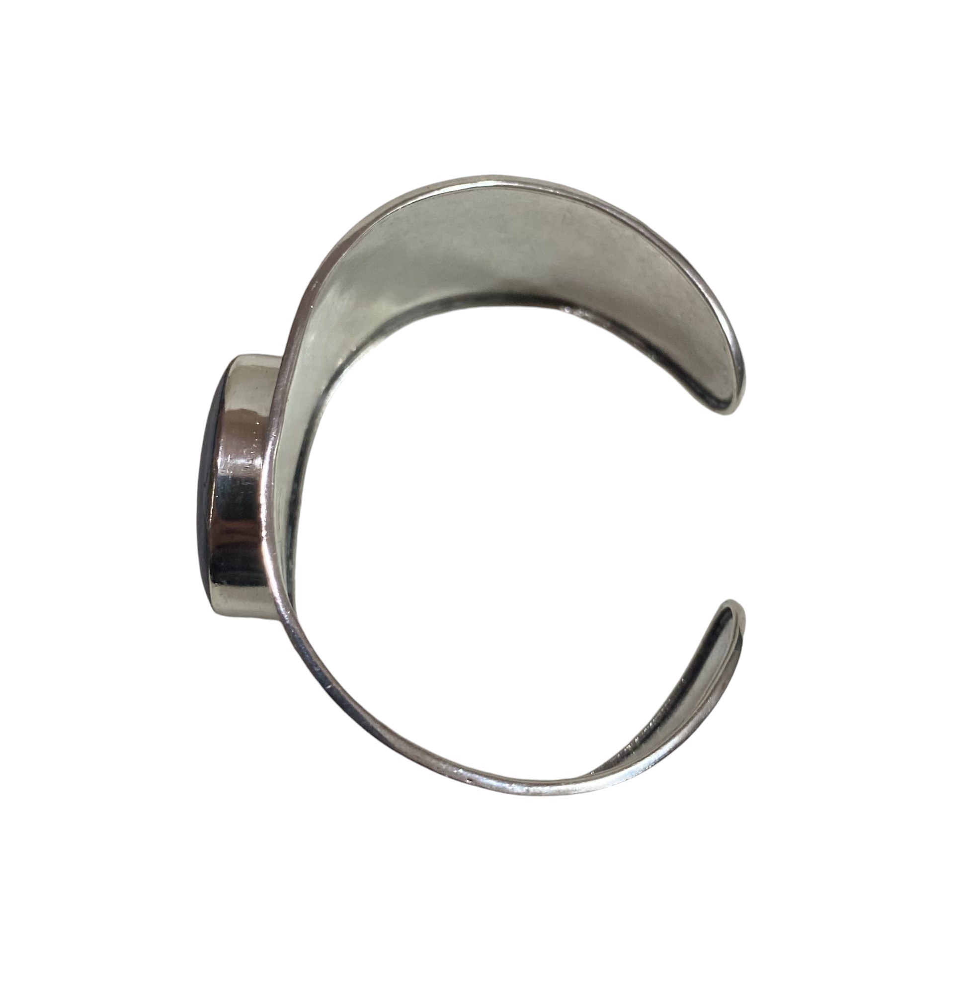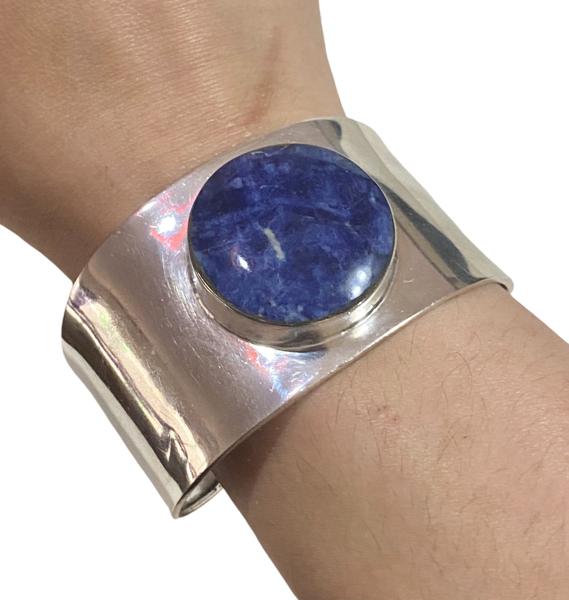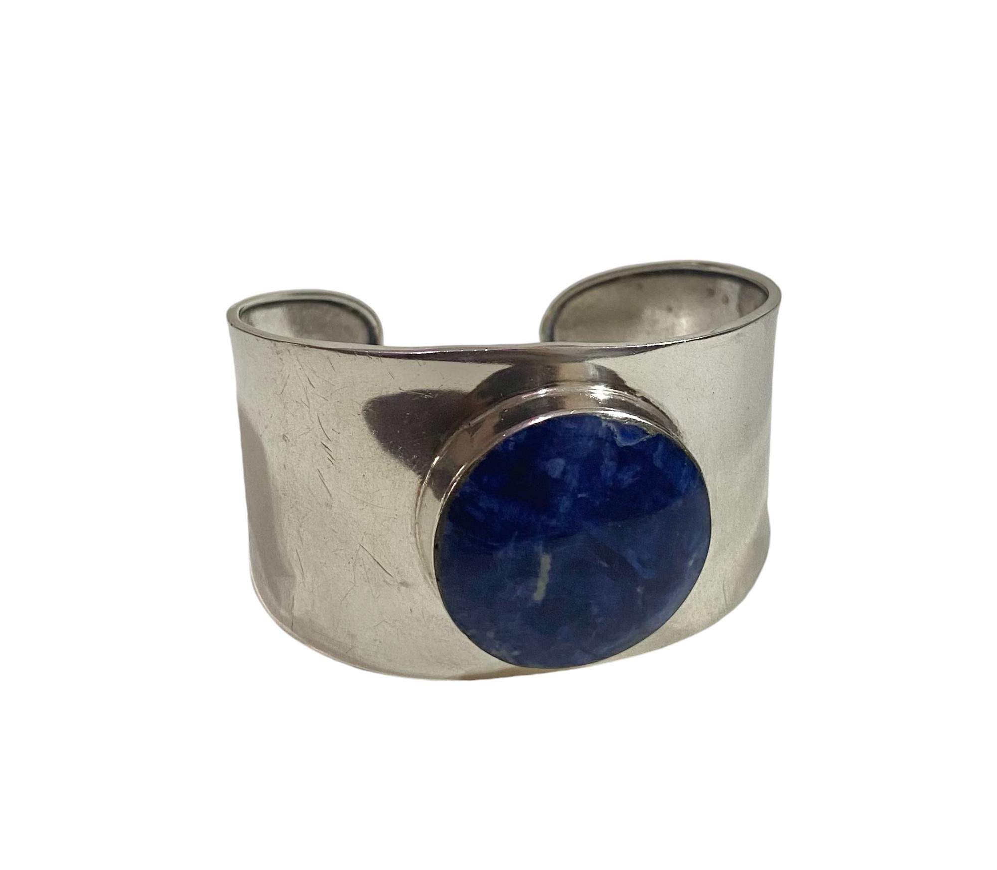Hermoso brazalete de Plata con Lapizlasuli engarzado. El mismo no tiene cierre, y se coloca fácilmente en la muñeca. Tiene sello. Diseño sencillo con dije pulido.