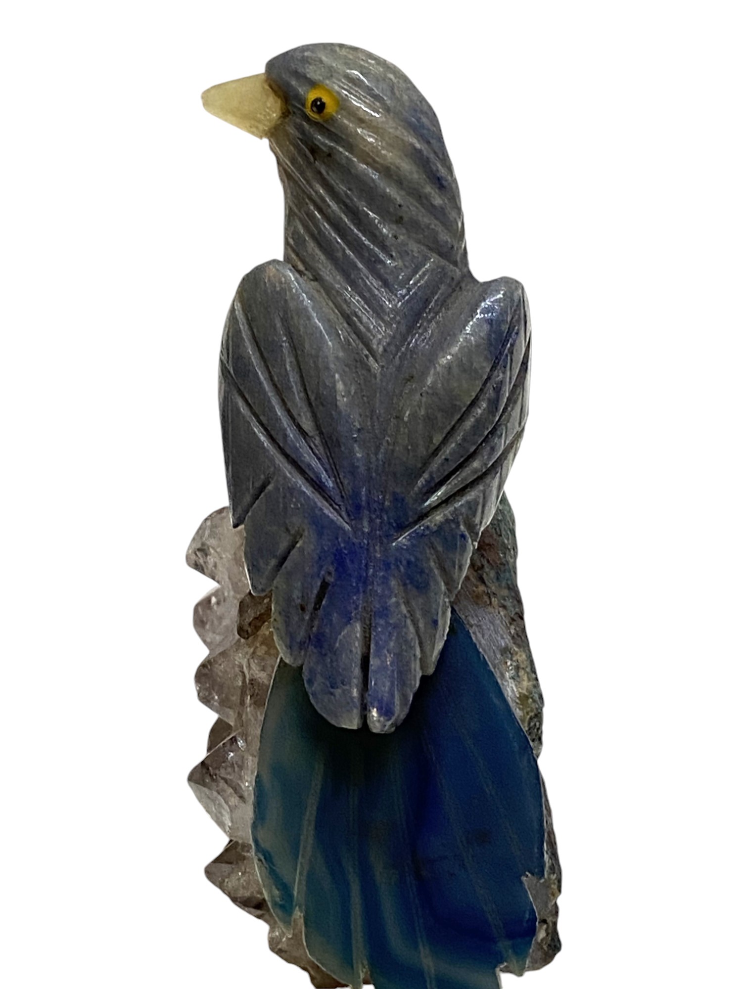 Ave tallada en piedra con diferentes combinaciones de cuarzos sobre base de Amatista clara.